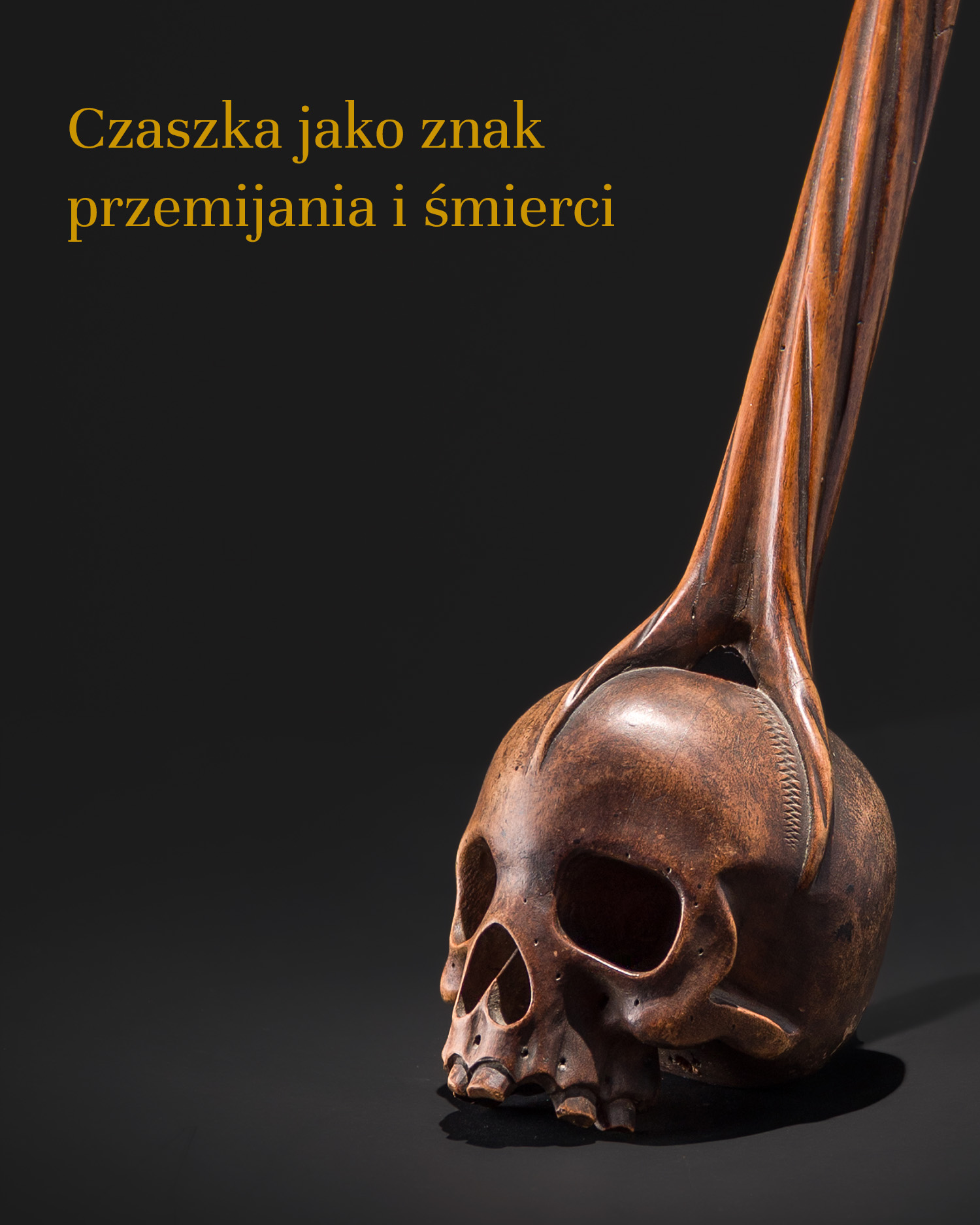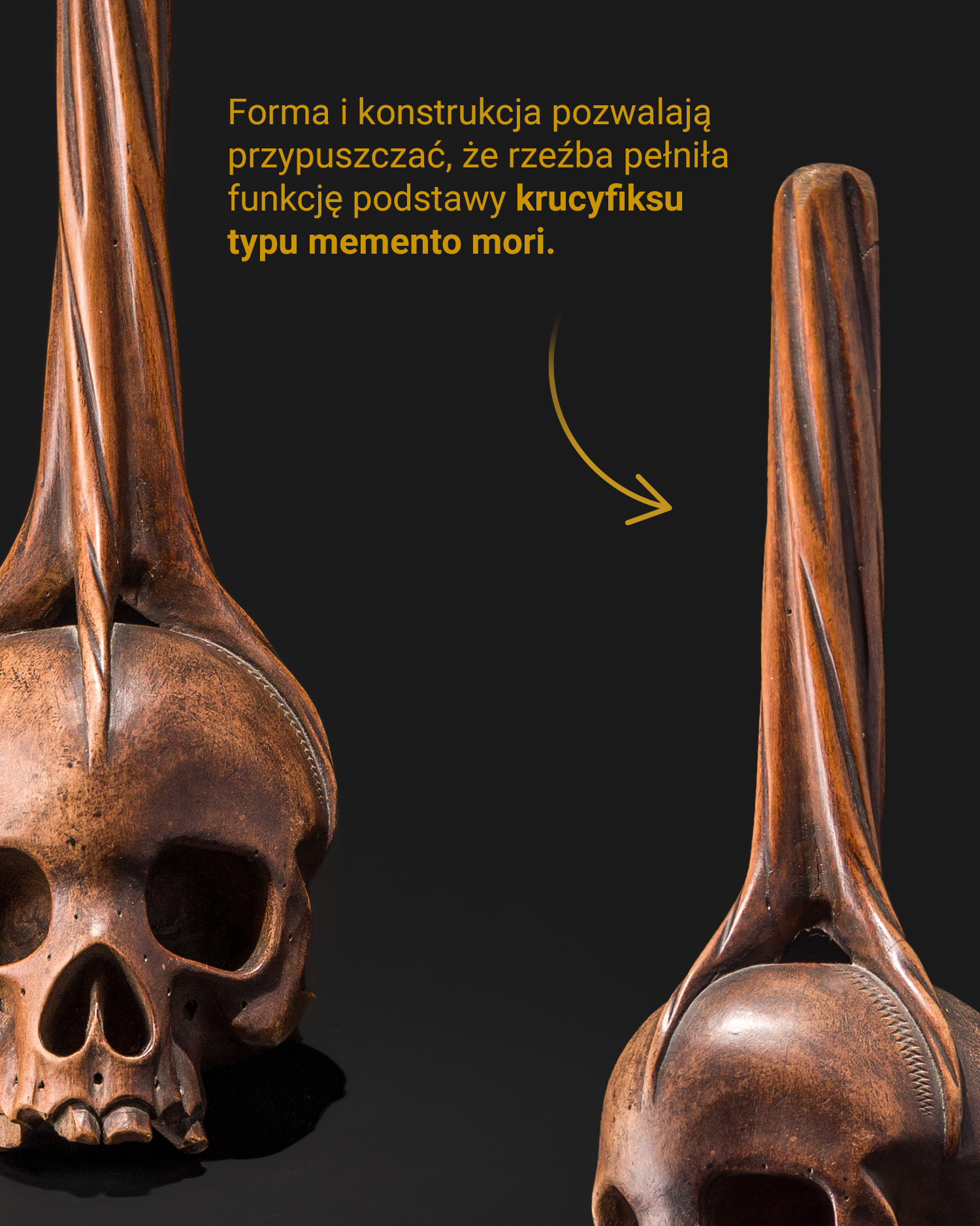 Unikatowa rzeźba z ciemnego drewna przedstawiająca realistycznie wyrzeźbioną ludzką czaszkę, obejmowaną od góry czterema masywnymi uchwytami o formie przypominającej szpony lub korzenie. Uchwyty powyżej łączą się i skręcają w jedną, zwartą formę, przypominającą stylizowany pień drzewa, zakończony płasko ściętą górną powierzchnią z wyżłobionym na całą szerokość rowkiem, co wskazuje, że obiekt stanowił pierwotnie część większej konstrukcji. Czaszka została wyrzeźbiona z dużą dbałością o detale anatomiczne, takie jak szwy czaszkowe, otwory nosowe oraz uzębienie. Forma i konstrukcja pozwalają przypuszczać, że rzeźba pełniła funkcję podstawy krucyfiksu typu memento mori; brakujący element w postaci rzeźbionych kości pod potylicą powoduje, że obiekt prezentuje się obecnie w lekkim pochyleniu, podczas gdy pierwotnie ustawiony był pionowo.