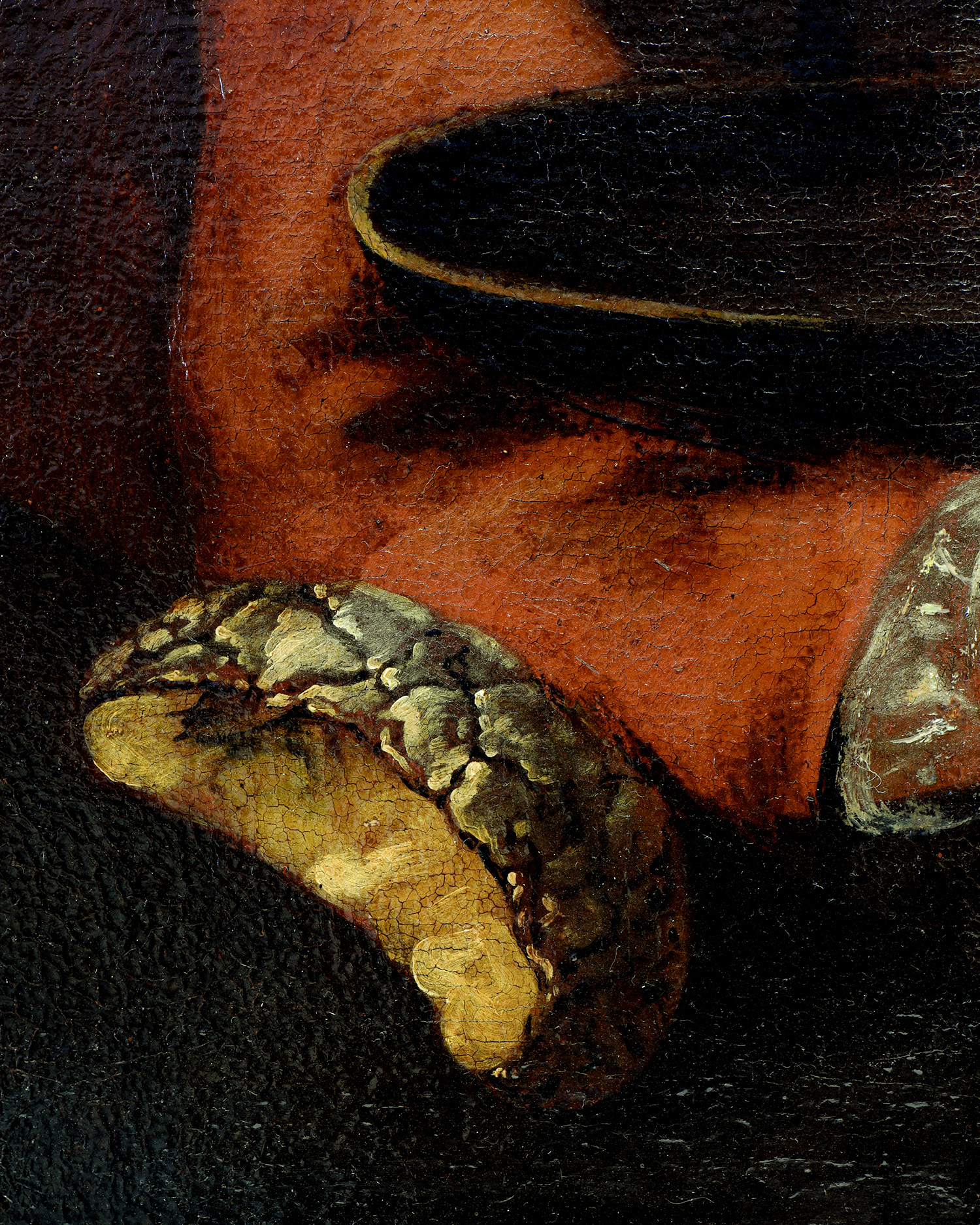 Paleta barwna utrzymana jest w tonacjach ciepłych brązów, czerwieni i ochry, z wyraźnymi kontrastami światłocieniowymi, które plastycznie modelują twarz i dłonie oraz wydobywają postać z ciemnego tła.