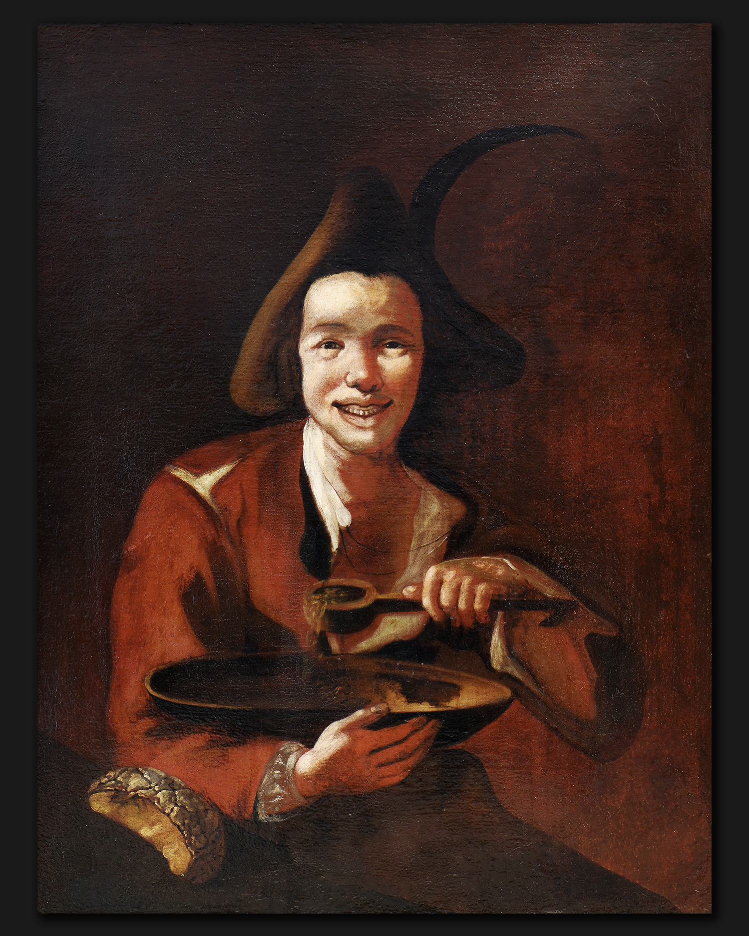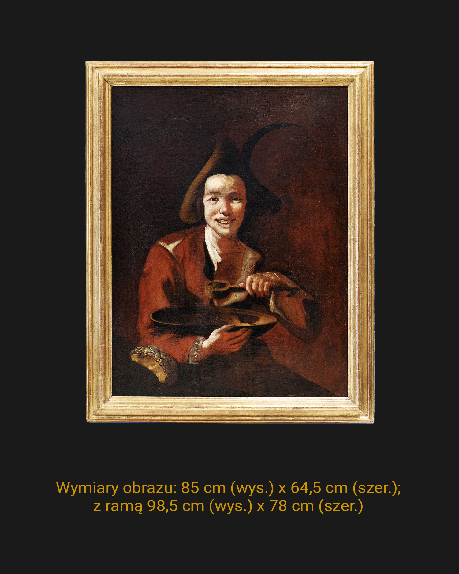 Portret ukazuje młodzieńca wywodzącego się z warstw plebejskich, ujętego w półpostaci, siedzącego na neutralnym, ciemnym tle. Chłopiec zwrócony jest frontalnie, jego wesoły wyraz twarzy podkreśla szeroki uśmiech odsłaniający zęby. W prawej ręce trzyma dużą, drewnianą miskę, zaś w lewej łyżkę, którą nabiera strawę. Młodzieniec ubrany jest w białą koszulę i prosty, kasztanowy kubrak oraz trikorn, czyli charakterystyczny trójkątny kapelusz, ozdobiony piórkiem. W lewym dolnym rogu obrazu widoczny jest fragment stołu, na którym leży napoczęty bochenek chleba.