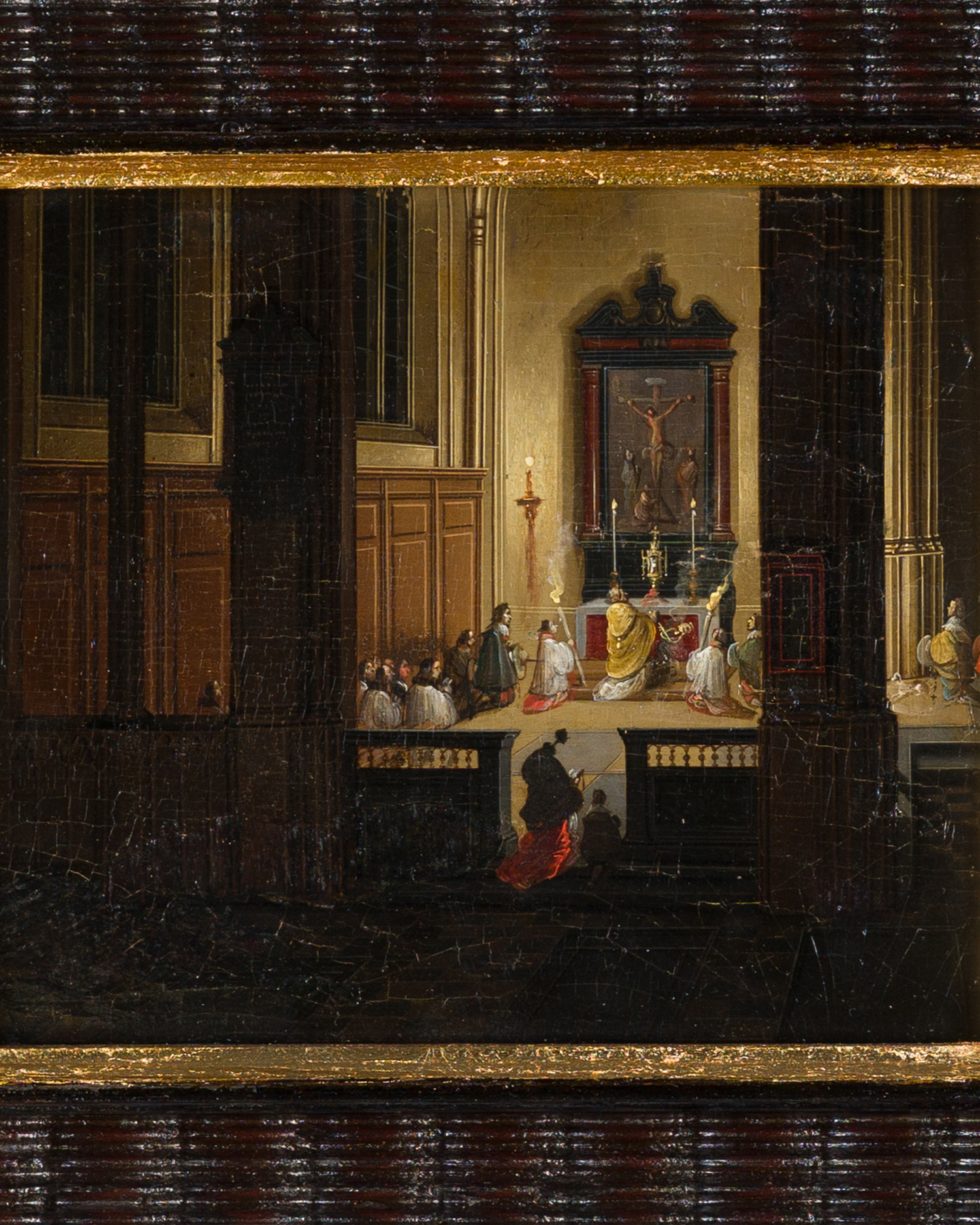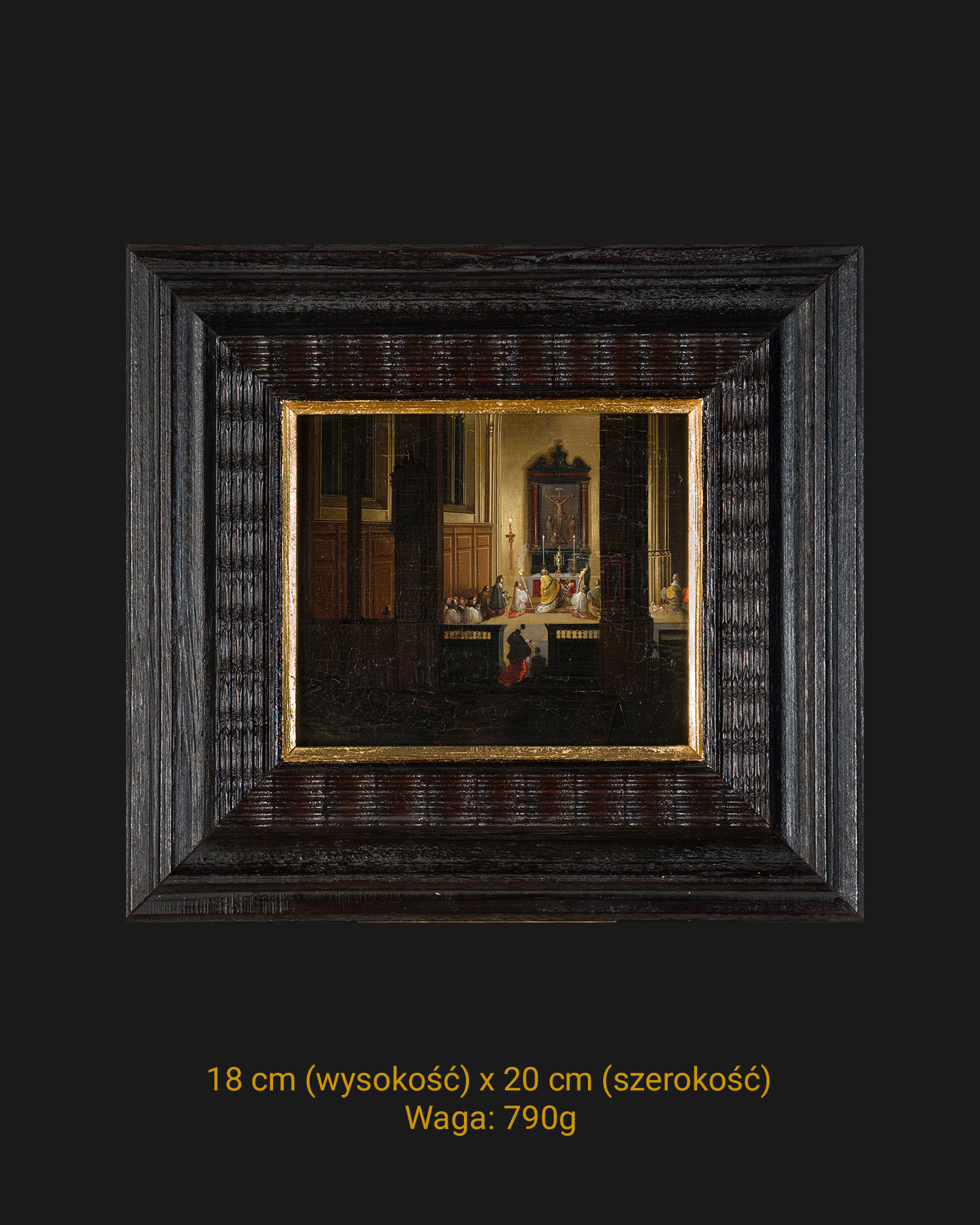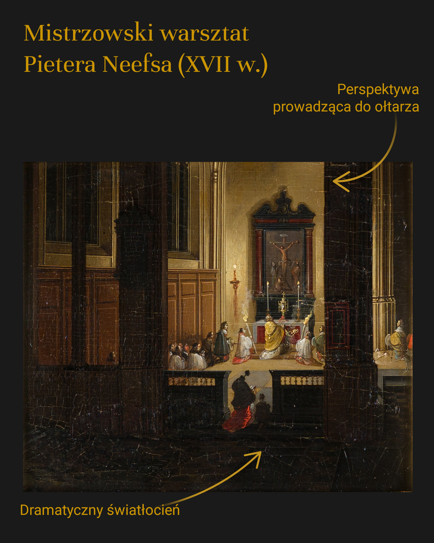 Obraz przedstawia wnętrze gotyckiego kościoła, autorstwa Pietera Neefs the Younger (1620–po 1675), flamandzkiego malarza specjalizującego się w przedstawieniach wnętrz sakralnych XVII wieku. Kompozycja oparta na precyzyjnej perspektywie linearnej prowadzi wzrok ku ołtarzowi głównemu, wokół którego zgromadzeni są wierni i duchowieństwo uczestniczący w liturgii.