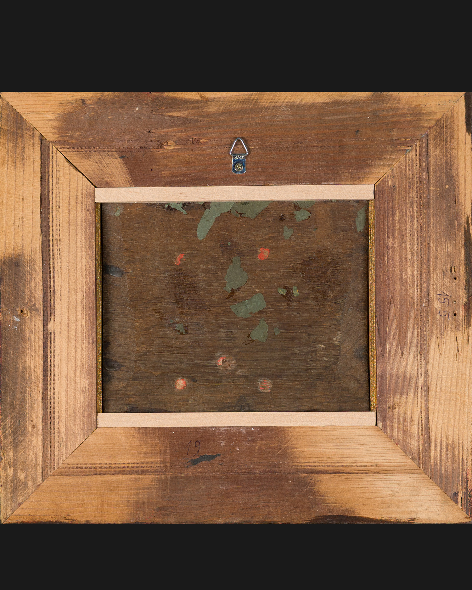 Obraz wykonany techniką oleju na desce, w typowej dla szkoły flamandzkiej. Rama oryginalna, drewniana, fornirowana, z zachowaną pozłacaną krawędzią.