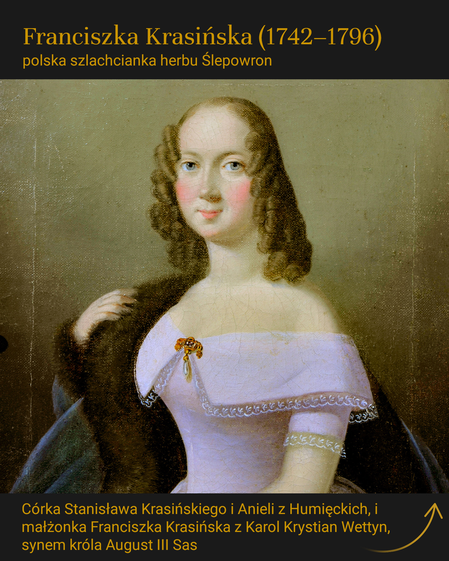 Franciszka Krasińska (1742–1796) była polską szlachcianką herbu Ślepowron, córką Stanisława Krasińskiego i Anieli z Humięckich. W 1760 roku zawarła morganatyczne małżeństwo (związek osoby z dynastii panującej z partnerem o niższym statusie społecznym, który nie dawał prawa do tronu ani pełnych tytułów dynastycznych) z Karolem Krystianem Wettynem, synem króla Polski Augusta III Sasa, co z czasem zapewniło jej tytuł księżnej kurlandzkiej i saskiej. Choć związek początkowo nie był oficjalnie uznany, Franciszka zajęła ważne miejsce w historii polskiego dworu XVIII wieku. Zmarła w Dreźnie, gdzie spędziła ostatnie lata życia.