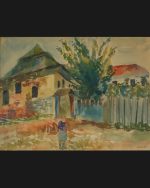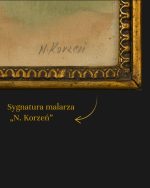 Akwarela na papierze przedstawiająca widok na zabudowę północnego narożnika Małego Rynku ze schematycznie ujętą postacią kobiecą na pierwszym planie. Po lewej stronie widoczna południowo-zachodnia fasada synagogi z charakterystycznym, łamanym dachem. Po prawej ciągnie się, będące jej przedłużeniem, drewniane ogrodzenie z furtką. Zza ogrodzenia wystają nieduże drzewa (zapewne owocowe) oraz dach (kościoła?) pokryty dachówką. Sygnowany w prawym dolnym rogu „N. Korzeń”.