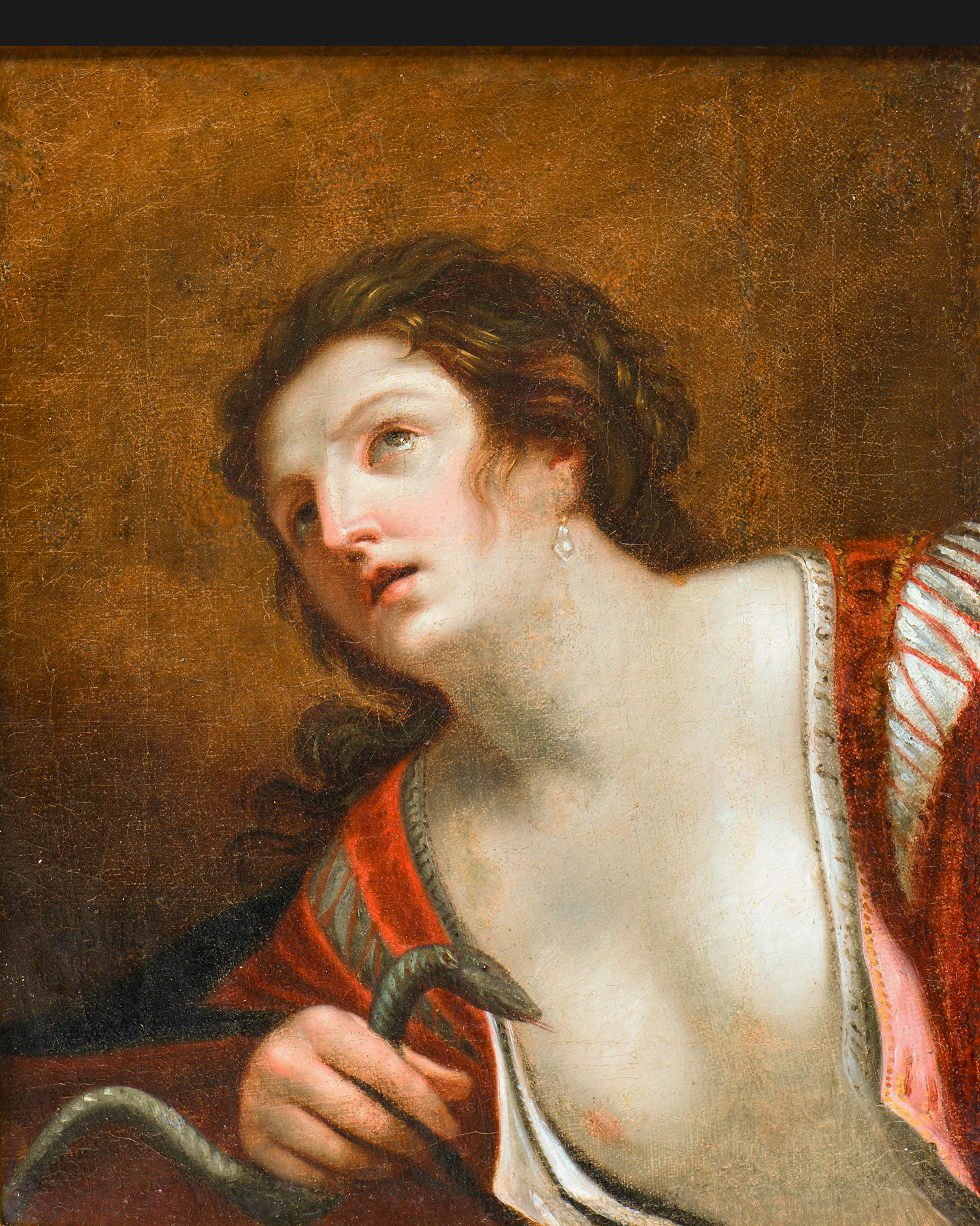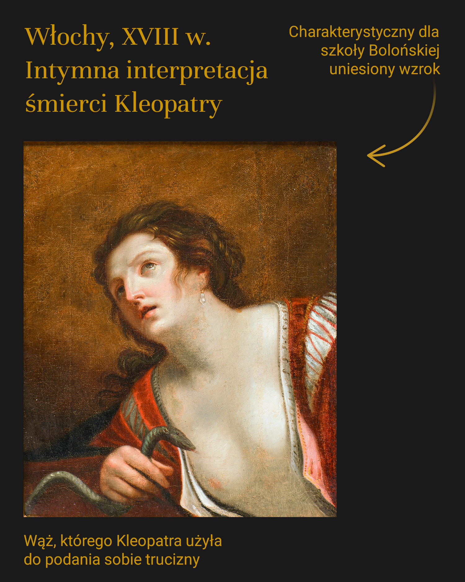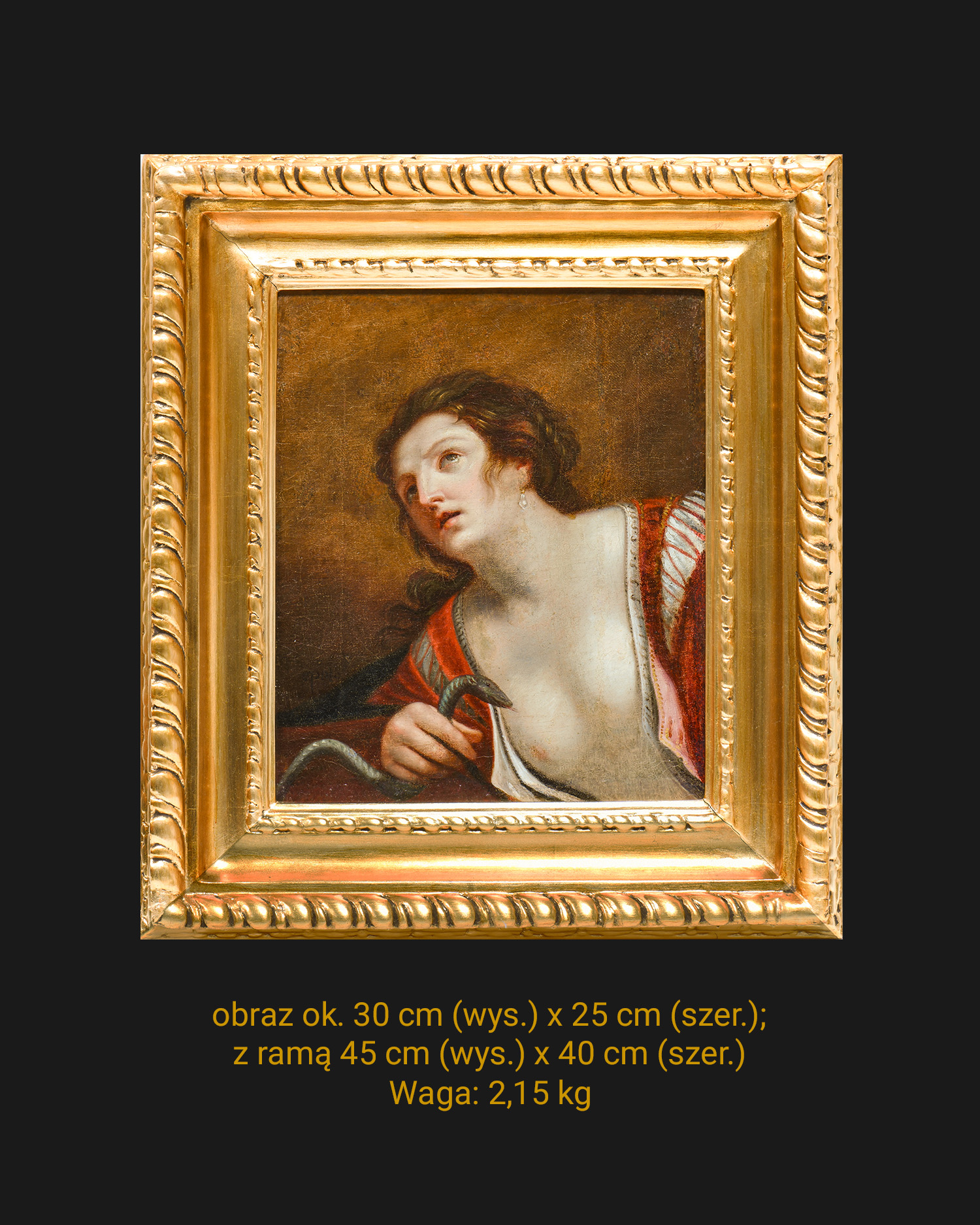 Obraz przedstawia Kleopatrę w chwili samobójstwa, ukazaną w półpostaci, w czerwonej, rozpiętej sukni z odsłoniętym biustem oraz wężem trzymanym przy piersi – jedynym atrybutem pozwalającym na jednoznaczną identyfikację sceny. Kobieta o alabastrowej cerze, uniesionej głowie i wzroku skierowanym ku górze została ujęta na neutralnym, ciemnobrązowym tle, zgodnie z tradycją szkoły bolońskiej. Miękki światłocień, idealizowany typ urody oraz spokojna ekspresja wskazują na wpływy malarstwa wywodzącego się z kręgu Guido Reniego i jego kontynuatorów. W lewym dolnym rogu widoczny jest końcowy fragment sygnatury „…epolo” lub „…epelo”, co wskazuje na włoskie pochodzenie artysty. Analiza stylu i sposobu ujęcia postaci pozwala datować dzieło na XVII-XVIII wiek, z prawdopodobnym miejscem powstania w Emilii-Romania (Włochy). Obraz oprawiony jest w barokową ramę rzeźbioną w drewnie i pomalowaną na złoto.