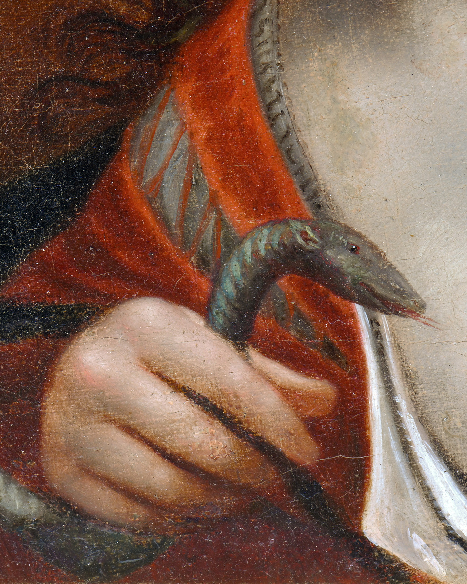 Głowa węża przypomina tu raczej głowę małego gryzonia, z wyraźnie zaznaczonymi „uszami”, co dobrze ilustruje charakterystyczną dla renesansu i baroku swobodę w przedstawianiu zwierząt. Artyści często opierali się na wyobrażeniach lub opisach, nie mając bezpośredniej styczności z ich rzeczywistym wyglądem, dlatego podobne uproszczenia i anatomiczne nieścisłości pojawiały się w ikonografii tamtego okresu.