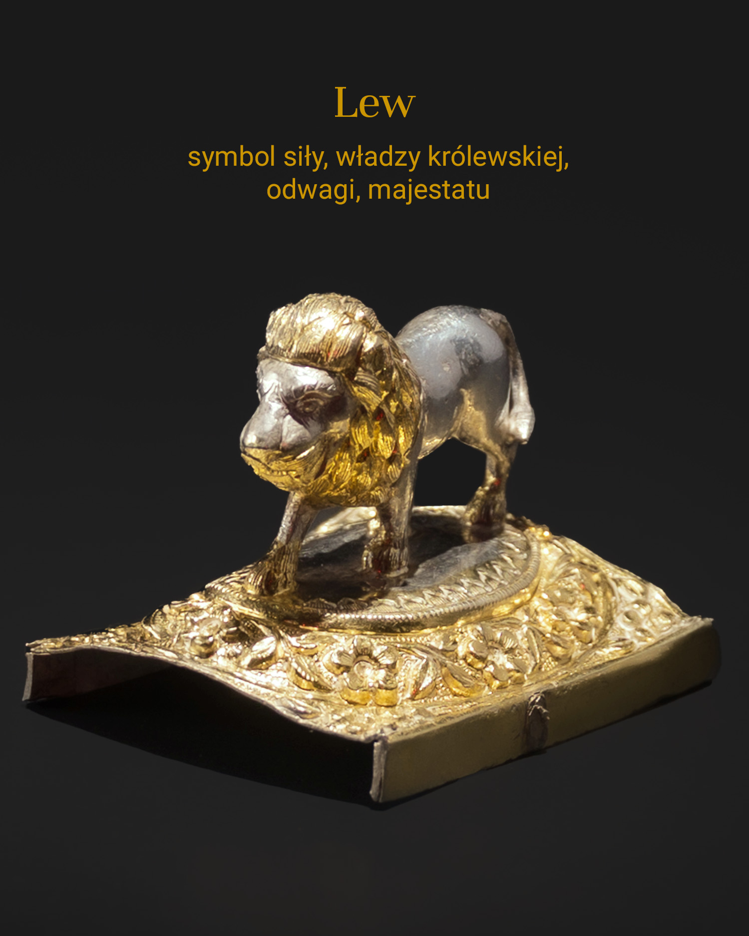Mała, realistycznie odwzorowana figurka lwa o wyraźnym detalu pyska i grzywy, wykonana ze srebra, częściowo złocona ogniowo. Osadzona na lekko wygiętym, dekorowanym florystycznie cokole. Widoczne ślady pracy ręcznej – cyzelowanie i rytowanie. Prawdopodobnie fragment większego obiektu – relikwiarza, szkatułki ceremonialnej lub bramy procesyjnej.