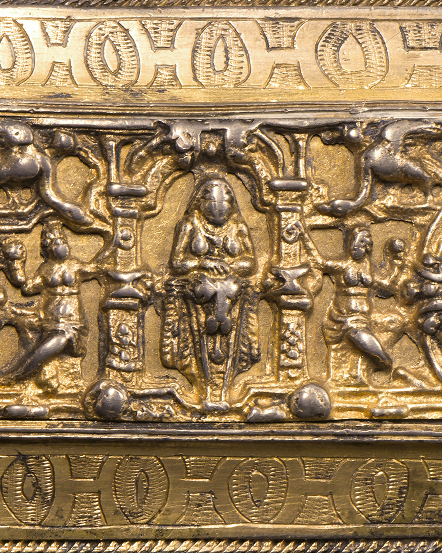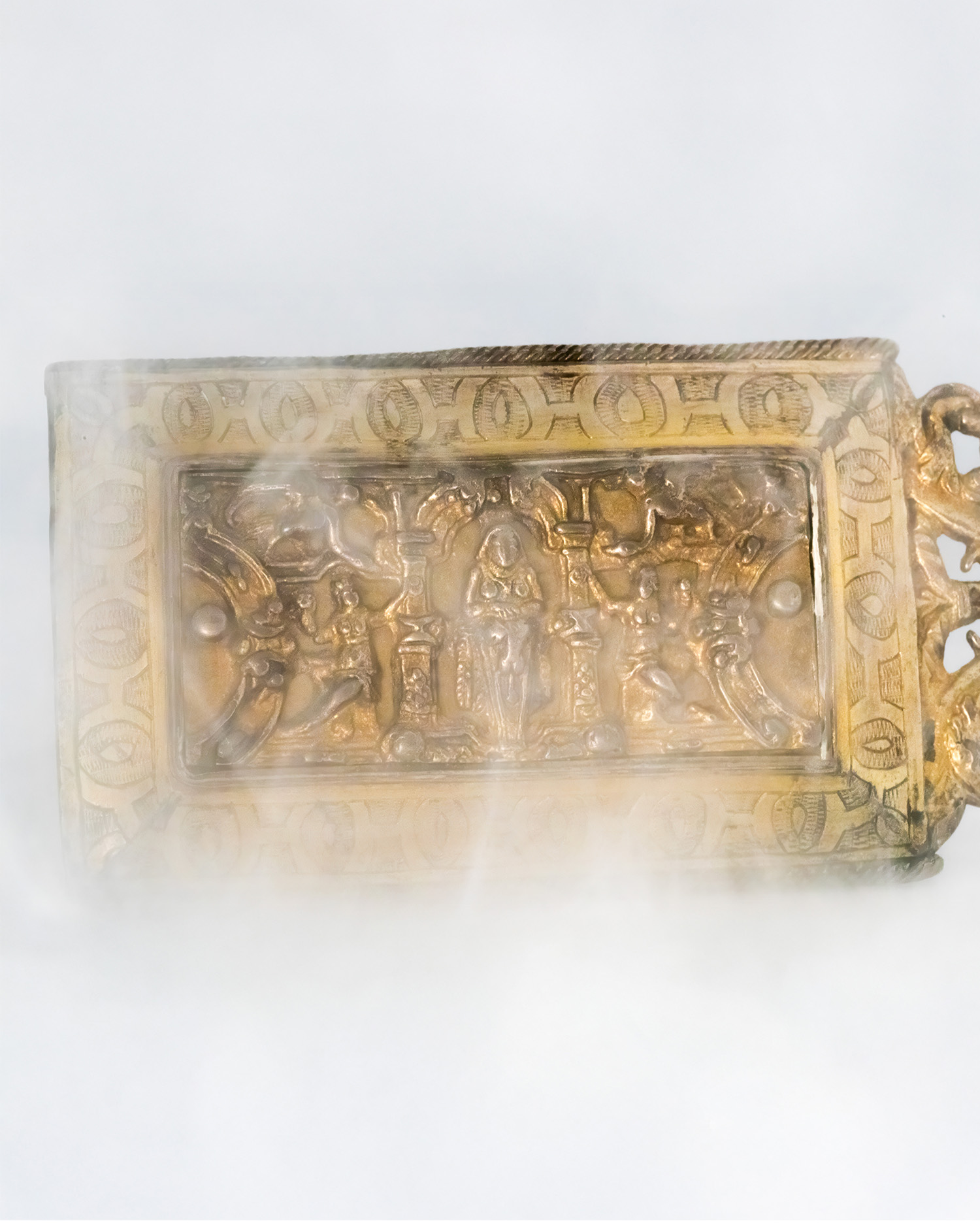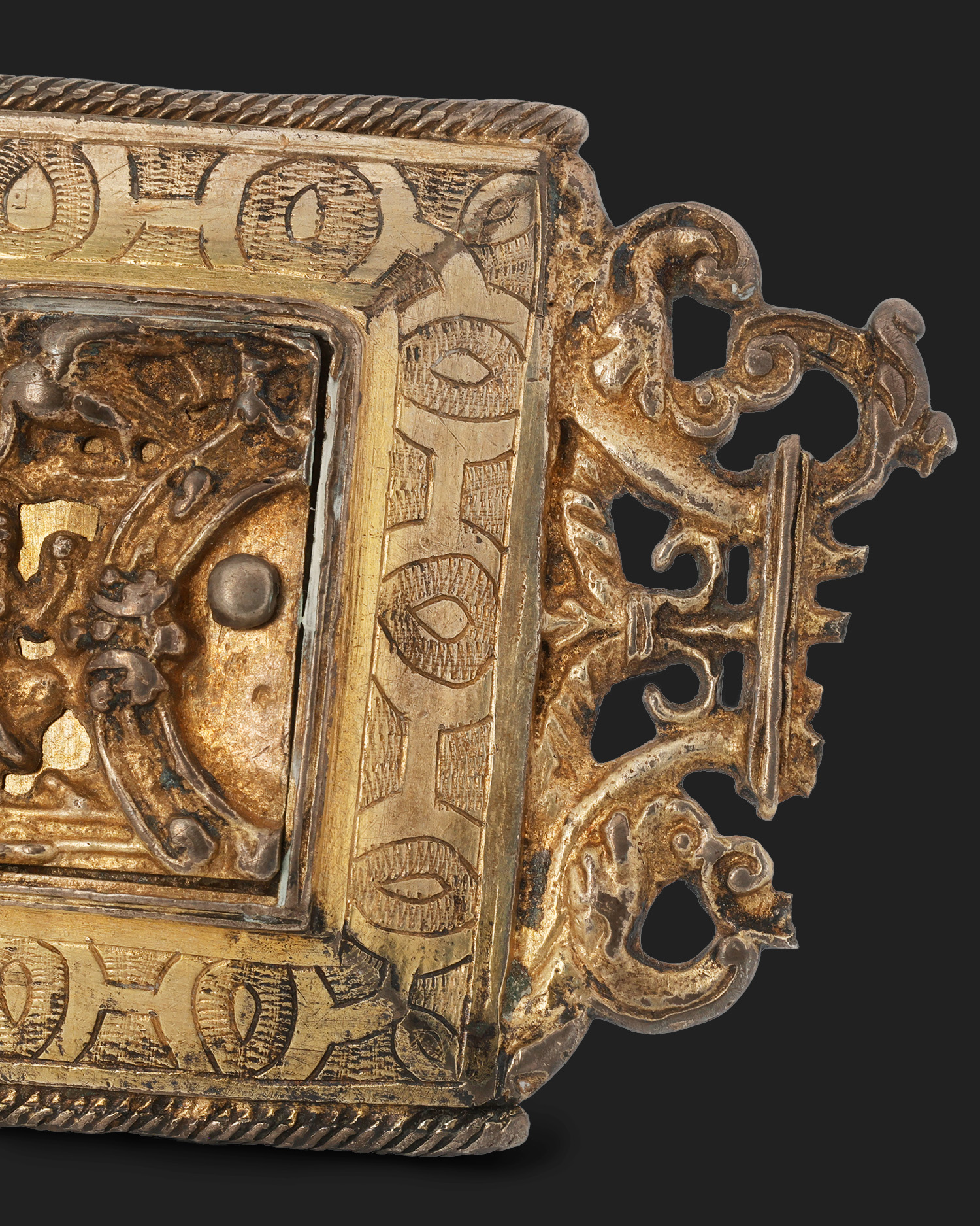 Klamra wyróżnia się połączeniem trzech różnych sposobów zdobienia zastosowanych na niewielkiej powierzchni: reliefowej sceny, rytowanego wzoru na skośnych bokach oraz ażurowego “języczka”. Na powierzchni widoczne są ślady cyzelowania, czyli ręcznego dopracowania detalu po odlewie, a także pozostałości złocenia, które nadawało klamrze luksusowy charakter.