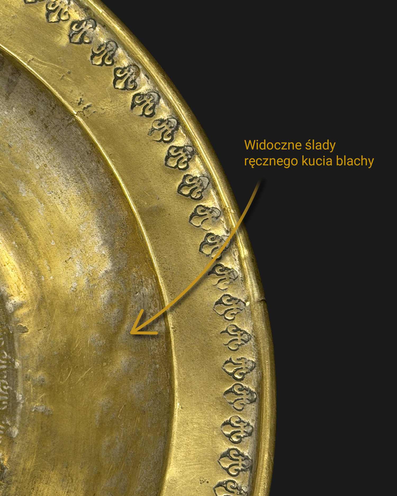 Misa okrągła, głęboka; powierzchnia lustra lekko wypukła, przechodząca ukośnym załamaniem w ściankę boczną; pośrodku lustra repusowana, stylizowana czaszka ludzka ponad skrzyżowanymi piszczelami, wokoło bordiura z fleur-de-lis wybijanych puncynami; wąski, lekko ukośny kołnierz z takim samym ornamentem przy krawędzi. Krawędź zawinięta na zewnątrz, prawdopodobnie wzmocniona drutem. Miejscami, zwłaszcza w zagłębieniach, widoczne pozostałości powłoki z białego metalu – najpewniej cyny.