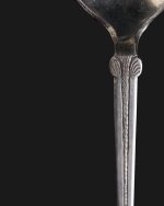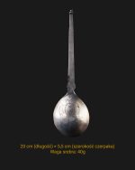 Srebrna łyżka stołowa wykonana na terenie Rzeczpospolitej około 1650 roku; barokowa z jajowatym czerpakiem, na odwrocie, przy łączeniu czerpaka i trzonka, grawerowany kartusz herbowy z pustą tarczą; trzonek w formie płaskiej, facetowanej sztabki, zdobiony grawerunkiem, pierwotnie zakończony profilowaną kopułką.