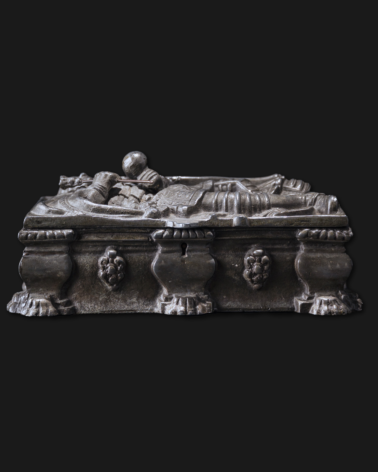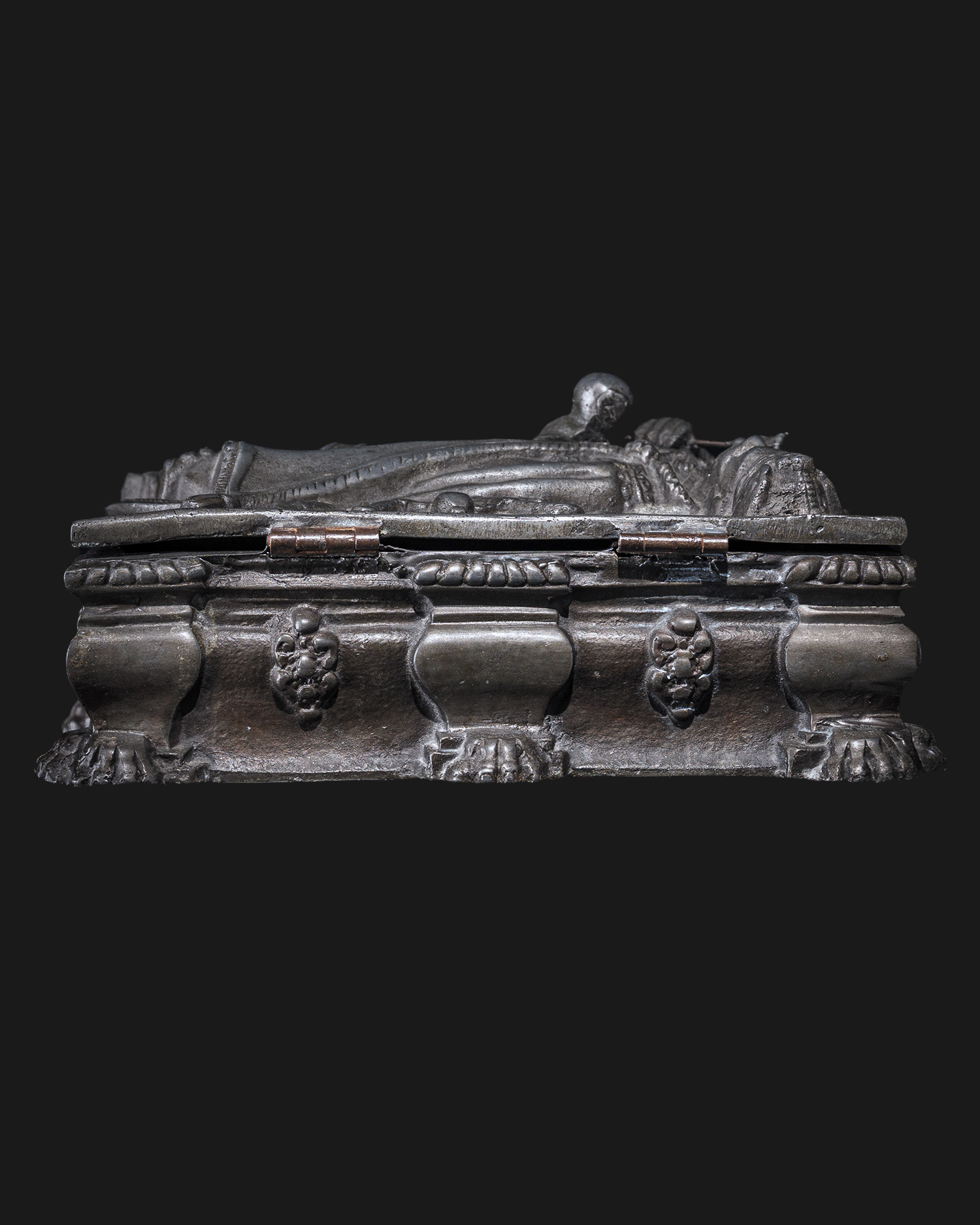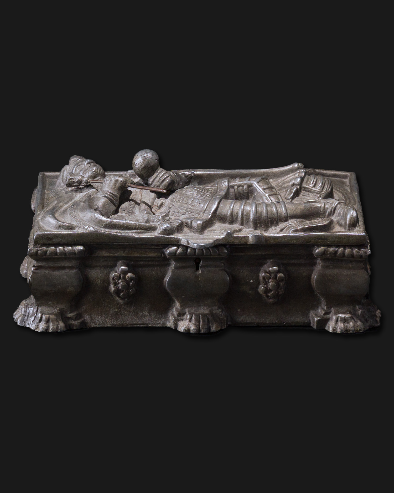 Karol Juliusz Minter (1812 – 1892), Szkatuła z pokrywą w formie płyty nagrobnej króla Stefana Batorego, cyna
