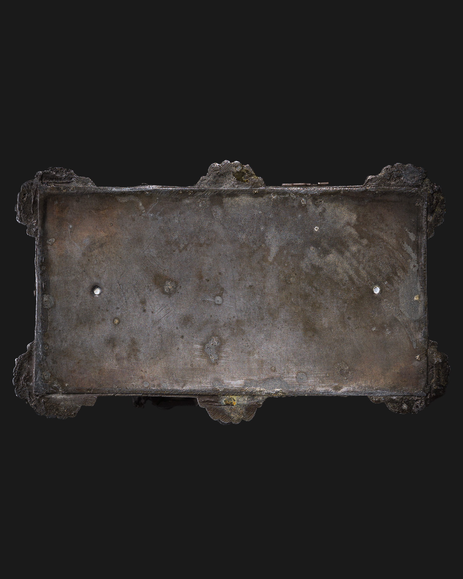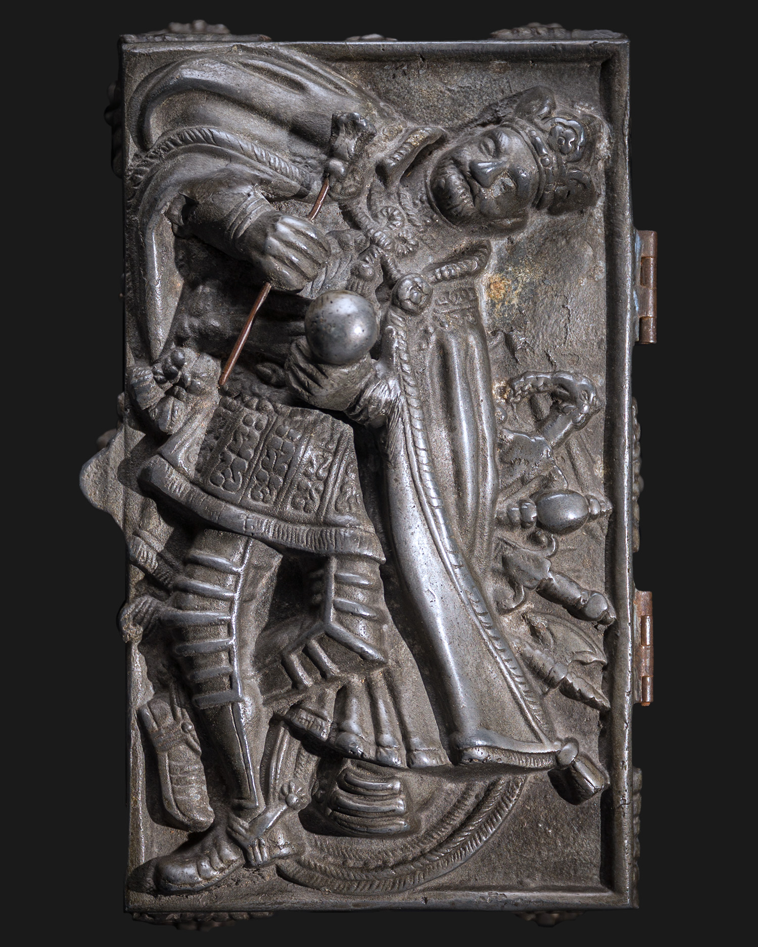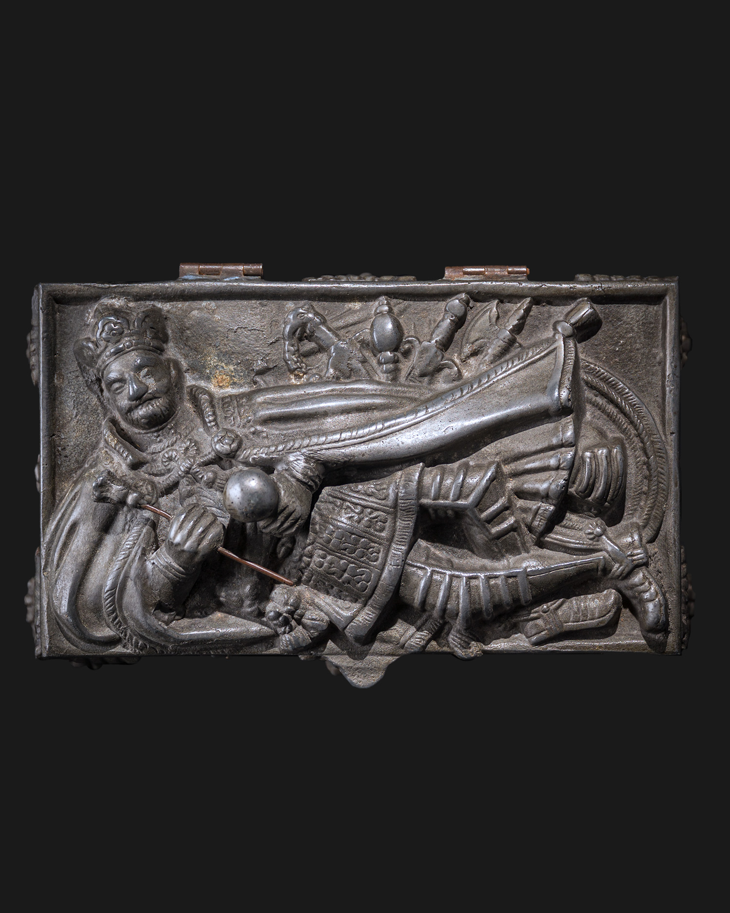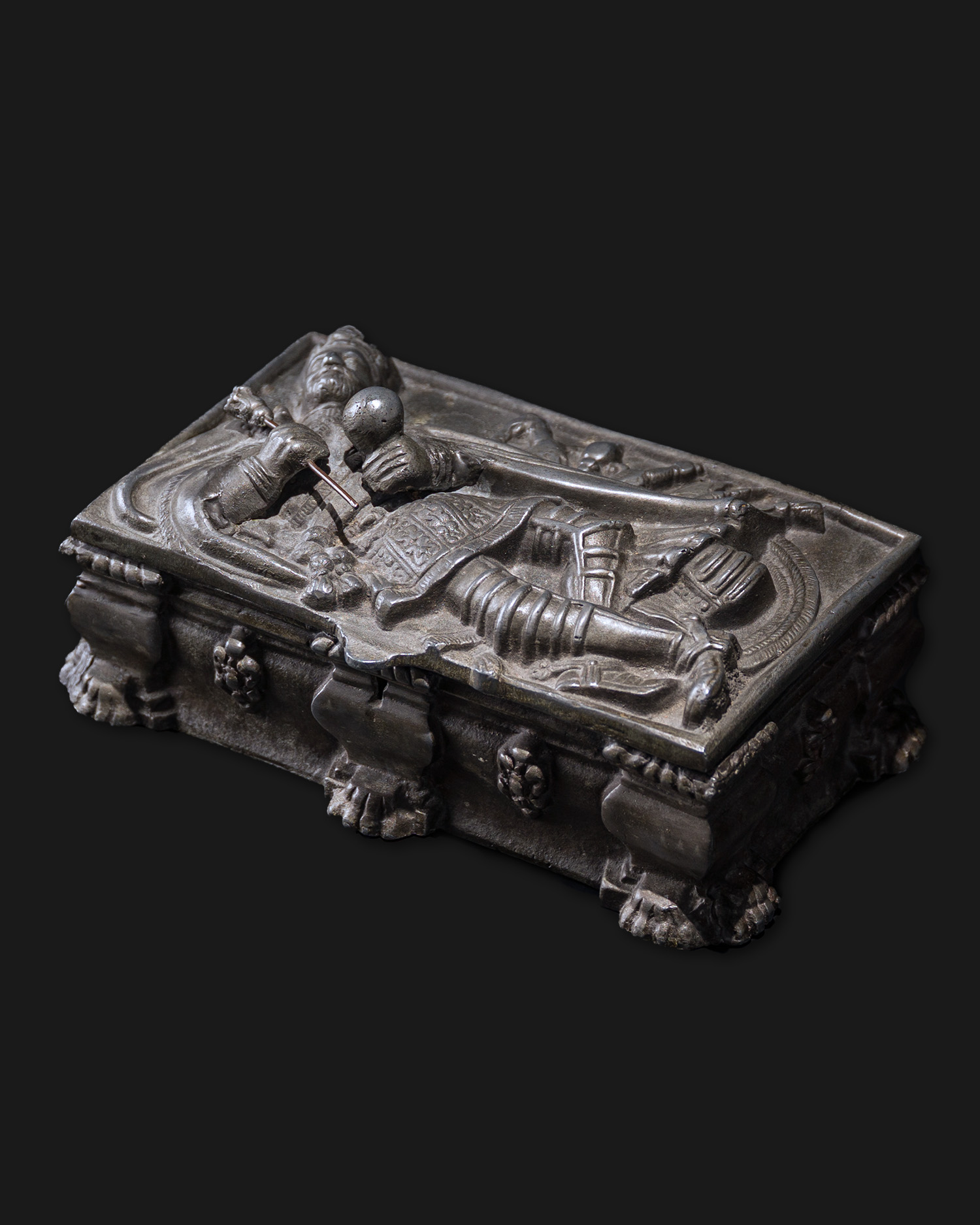 Karol Juliusz Minter (1812 – 1892), Szkatuła z pokrywą w formie płyty nagrobnej króla Stefana Batorego, cyna