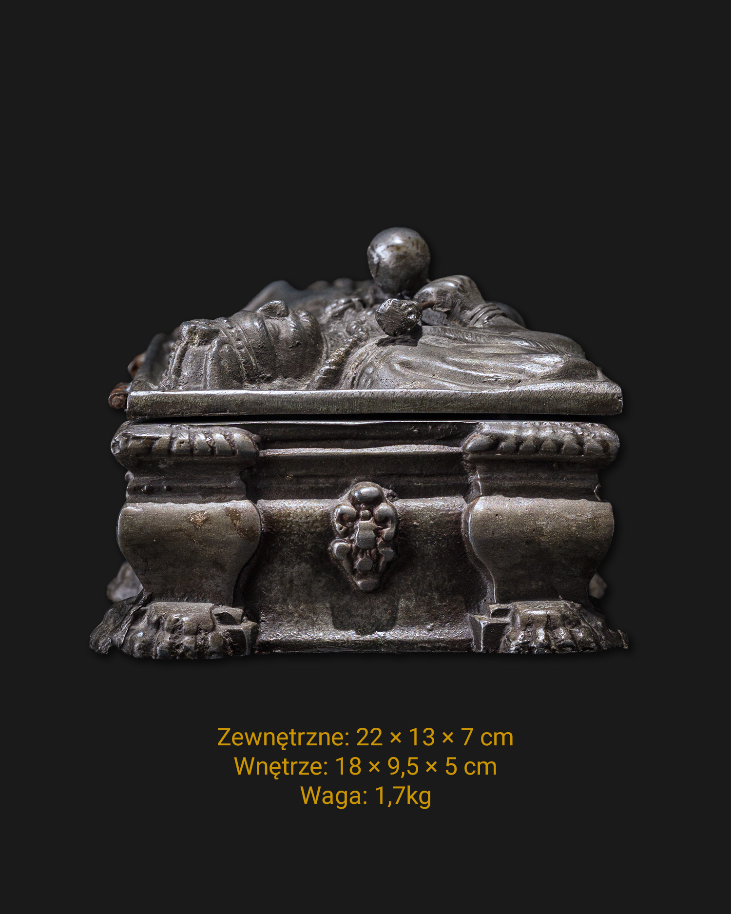 Cynowa szkatułka, tzw. „serwantkowa”, w formie grobowca króla Stefana Batorego. Korpus z wypukłymi bokami, zdobiony imitacjami okuć, wsparty na lwich łapach. Na wieku przedstawiony został model płaskorzeźby z nagrobka Stefana Batorego, znajdującego się w Kaplicy Mariackiej na Wawelu. Król pokazany został w pozycji półleżącej z berłem i jabłkiem, odziany w zbroję i płaszcz koronacyjny.