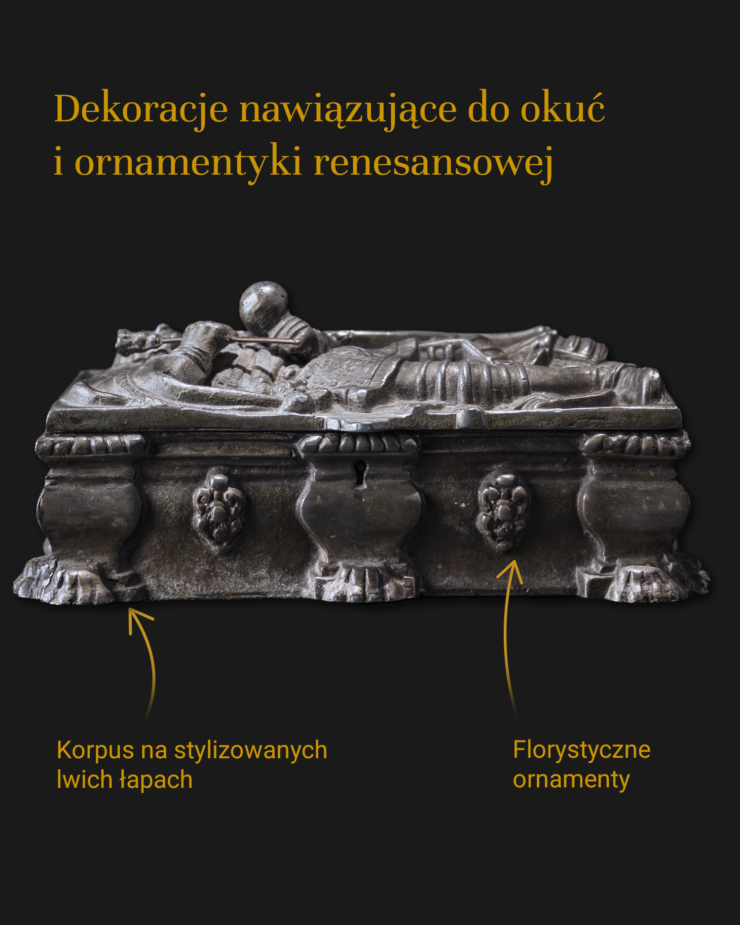 Wzornictwo eklektyczne łączy wpływy neorenesansowe i neobarokowe. Reliefowa pokrywa w formie epitafium, stylizowane lwie łapy oraz ornamentyka korpusu nadają szkatułce unikatowy charakter. Subtelne zróżnicowanie faktur, precyzja odlewu oraz proporcje kompozycji świadczą o wysokim poziomie artystycznym i kunszcie warsztatu.