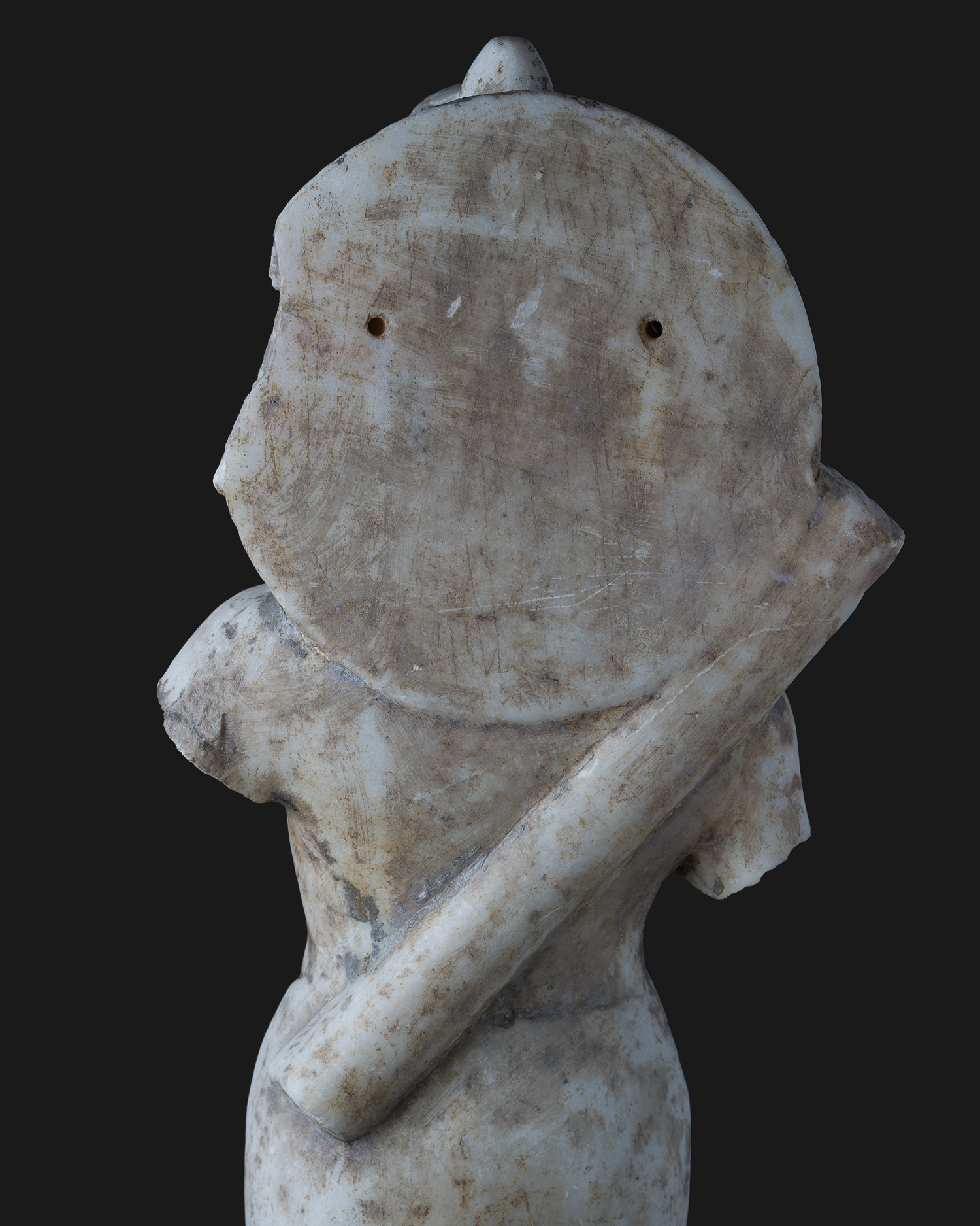 Ręce rzeźby nie zachowały się, pierwotnie w jednej z nich postać trzymała łuk – charakterystyczny element przedstawień tego bóstwa. dalej o tych ubytkach nie pisz, że są zgodne.