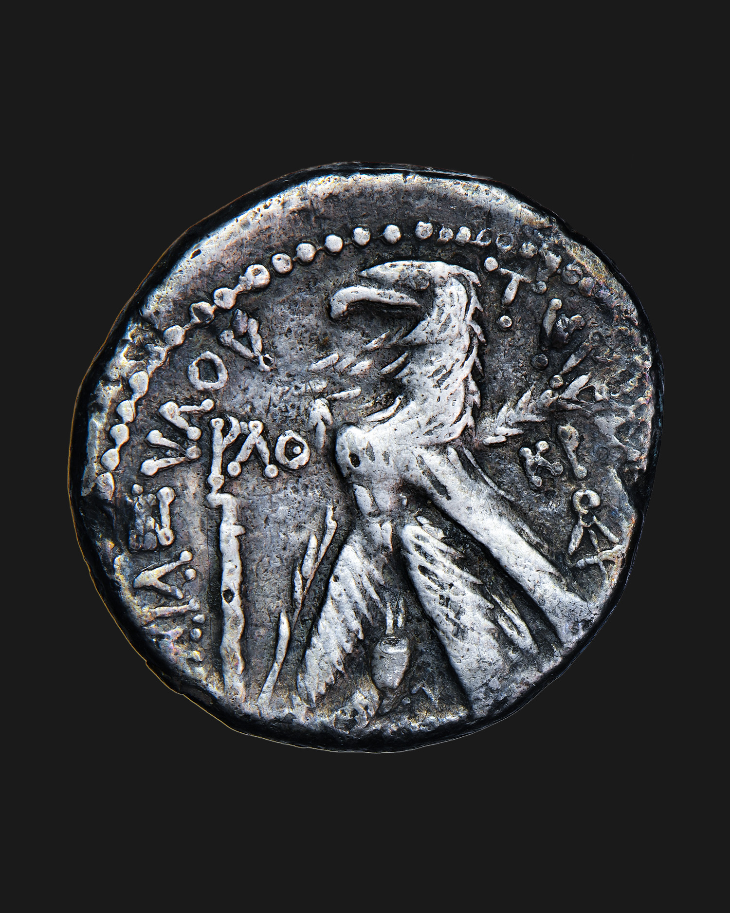 Rv. TYPOY [IEPAΣ] KAI AΣYΛOY, orzeł stojący w lewo na dziobie galery, na prawym skrzydle gałązka palmowa, w lewym polu litery PΛΘ (data) nad maczugą, w prawym KP nad monogramem, fenicka litera „Bet” pomiędzy łapami orła.