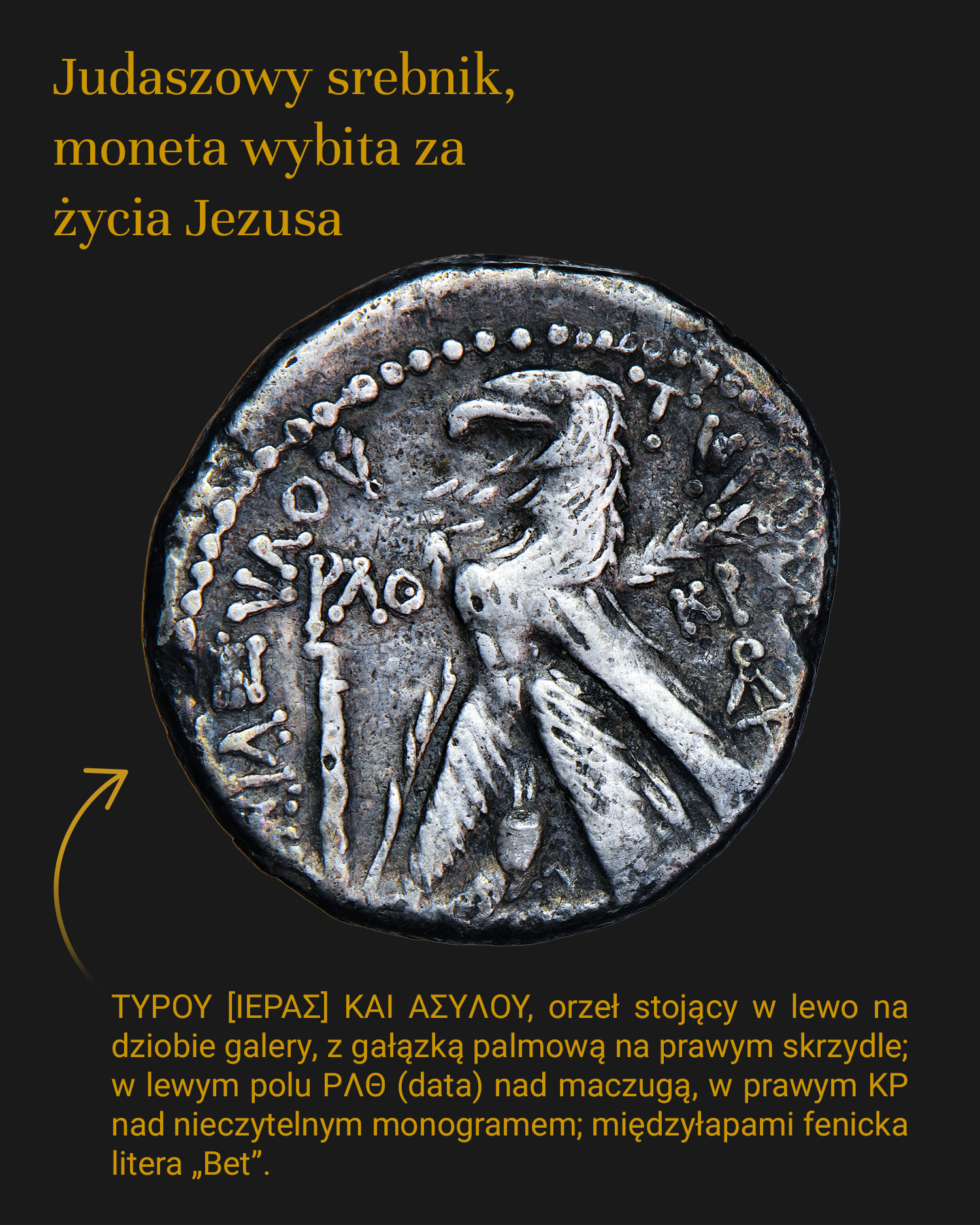 Mało kto zdaje sobie sprawę, że srebrniki, których 30 dostał Judasz Iskariota za wydanie Chrystusa, to nie symbol czy figura retoryczna, tylko rzeczywiste monety. Tymi monetami były szekle wybijane w Tyrze od ok roku 126/125 przed Chr. Szczególnie cenione są szekle wybite i będące w obiegu na terenie Judei za życia Jezusa – tak jak oferowana moneta.