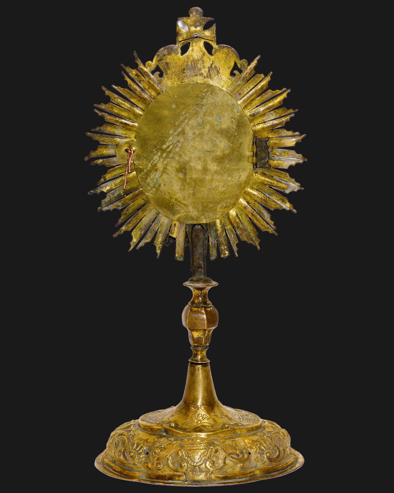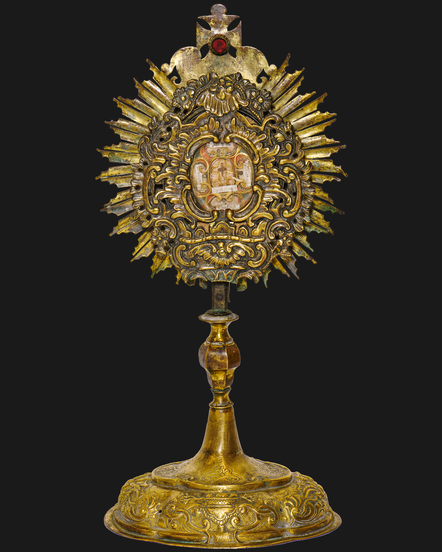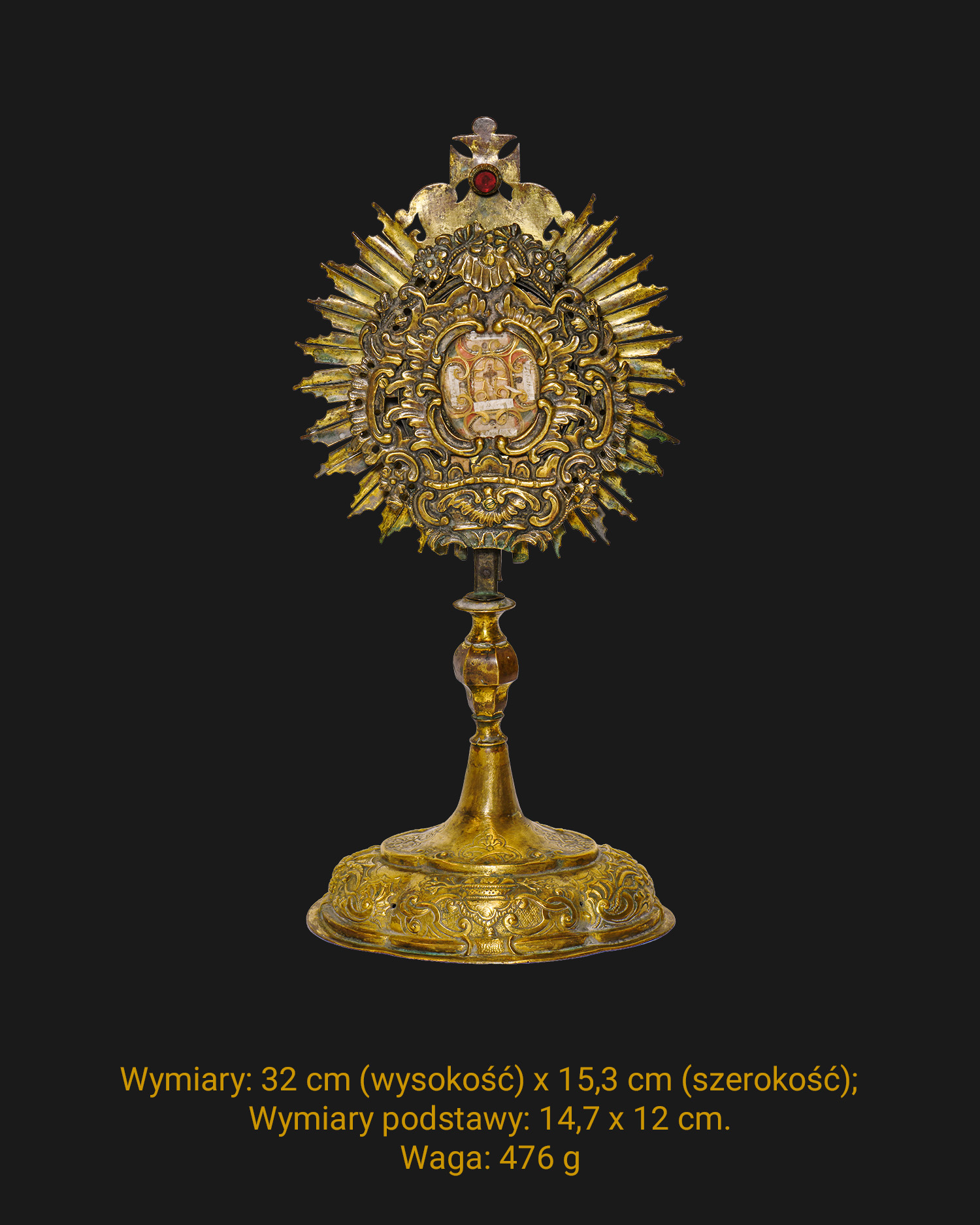 Barokowy relikwiarz w formie monstrancji, wykonany z brązu złoconego. Stopa owalna, wielostopniowa, zdobiona repusowanym i rytym ornamentem roślinnym. Trzon gładki z profilowanym nodusem. Reservaculum otoczone glorią gloria relikwiarza uformowana została ze strzępiastych, licznych promieni, na które nałożony jest kontrastujący ozdobny wieniec z pokryty rocaillami i motywami roślinnymi. W repozytorium umieszczona jest owalna kapsuła z blachy srebrnej, przeszklona od przodu. Szkło przy krawędzi zdobione ośmiobocznym fasetowaniem. Z tyłu pieczęć lakowa na sznureczkach. Na pieczęci widnieje herb: w ozdobnym kartuszu lew w lewo, a poniżej – oddzielony belką – naprzeciwlegle gryf w lewo. Całość wieńczy kapelusz kardynalski (Galero): kapelusz z szerokim rondem i zwisającymi sznurami z chwostami (fiocchi) będący oznaką godności kardynalskiej. Wewnątrz kapsuły umieszczono 5 relikwii, opisanych tuszem na banderolach.