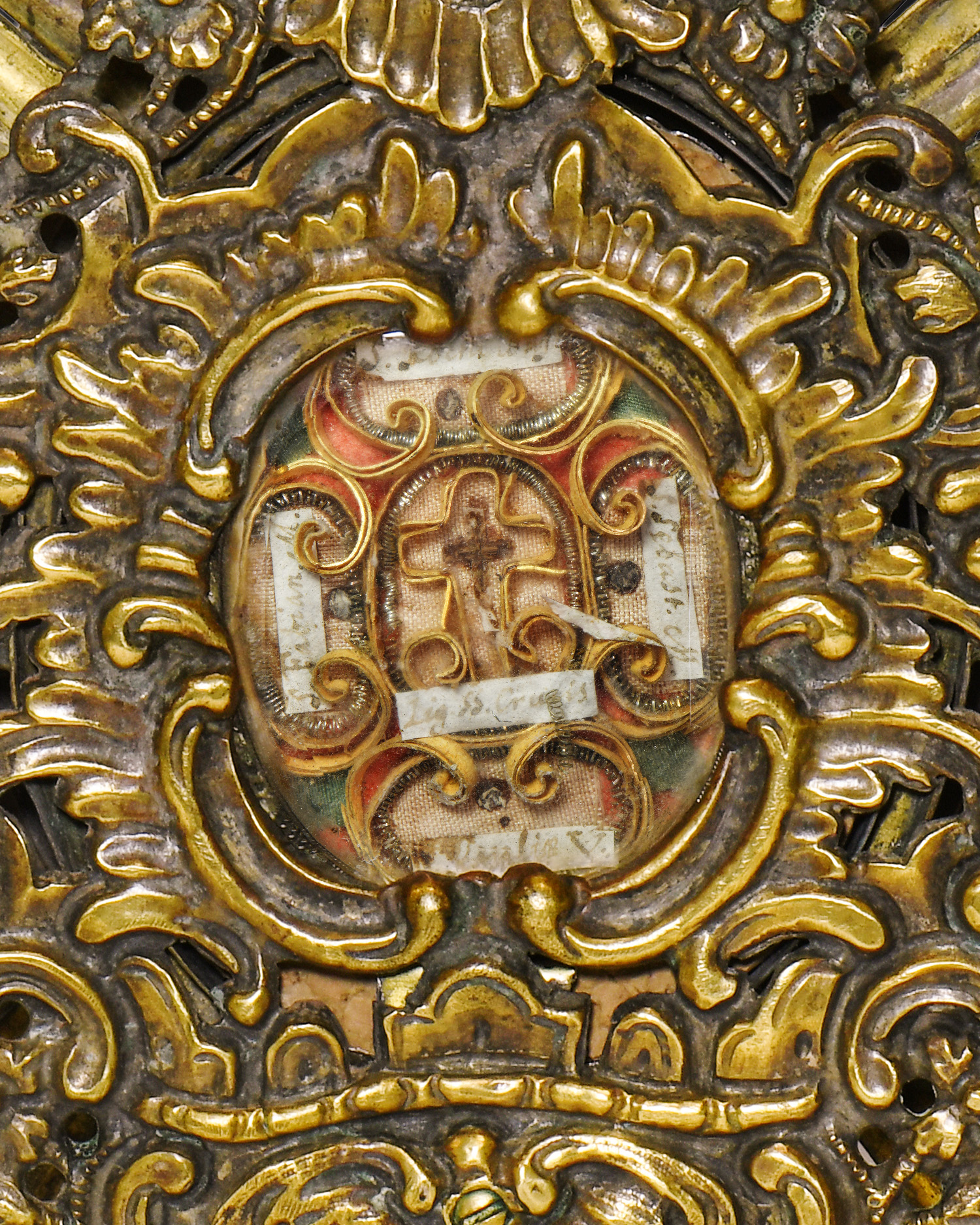 Relikwiarz z relikwią Krzyża Świętego i 4. świętych, brąz złocony, Europa Środkowa, XVIII w.