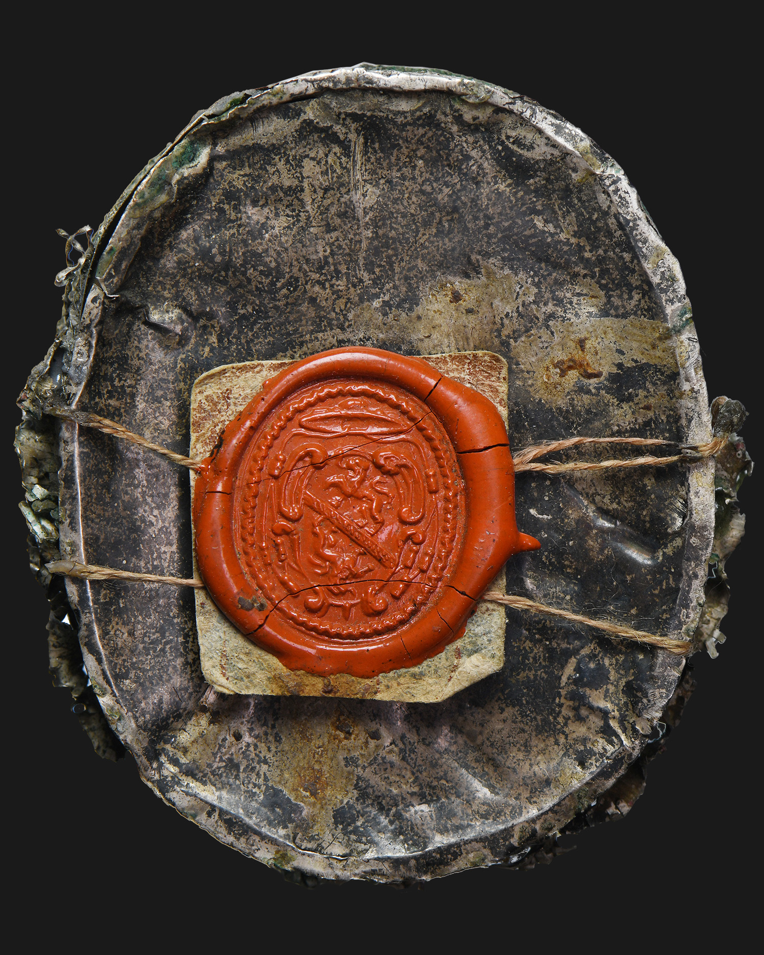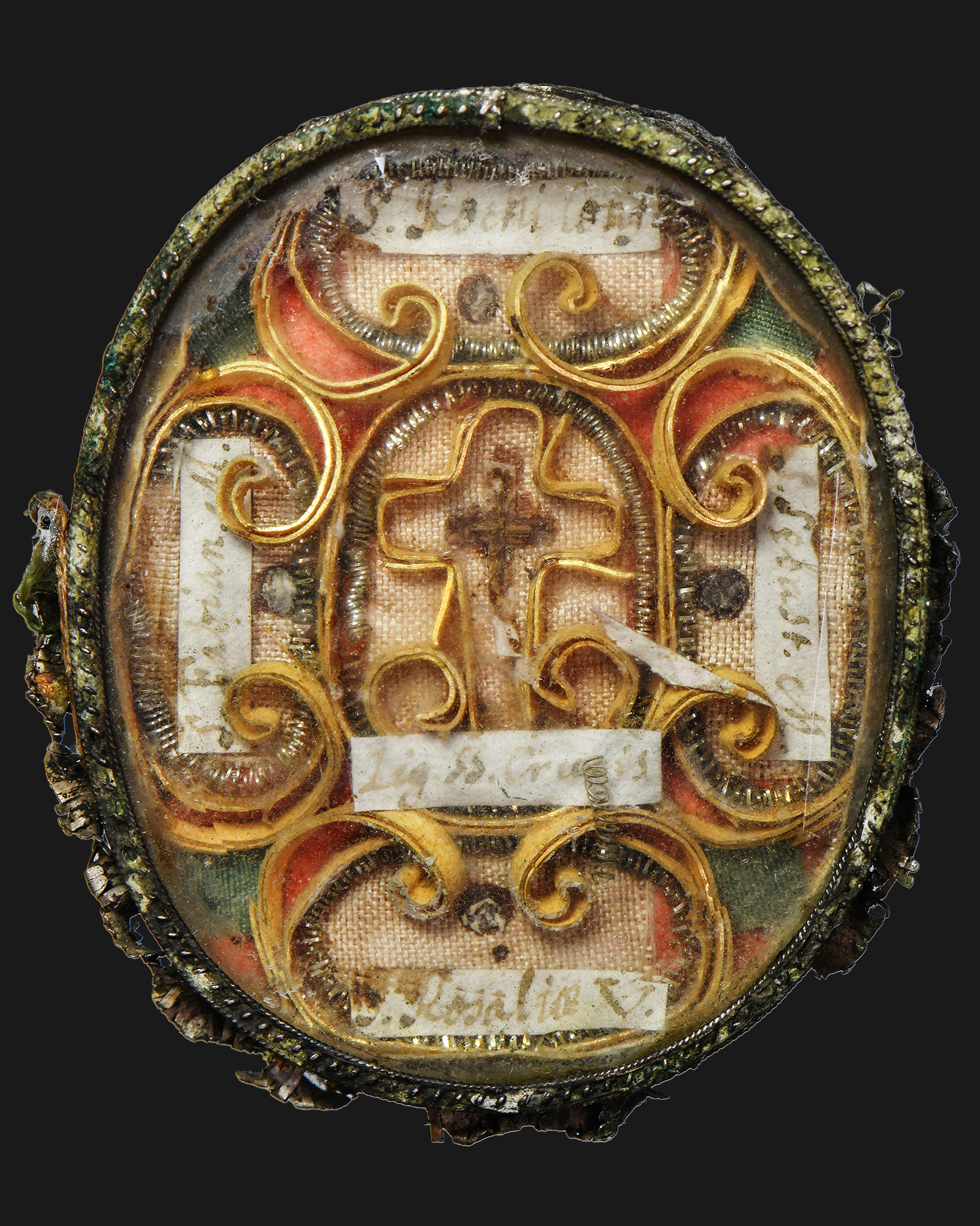Na środku: „Lig. SS Crucis” (Lignum S.S. Crucis) to skrót z łaciny oznaczający Lignum Sanctae Crucis, co tłumaczy się jako Drzewo Krzyża Świętego. Jest to określenie używane na relikwiach, wskazujące, że zawierają one cząsteczki Krzyża, na którym według tradycji chrześcijańskiej został ukrzyżowany Jezus Chrystus (tzw. Prawdziwy Krzyż – Vera Crux).
